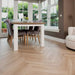 De combinatie van het strakke visgraatmotief met de natuurlijke eiken kleur maakt deze vloer tot een echte blikvanger. Tegelijkertijd is hij op praktisch vlak uitermate gebruiksvriendelijk. Het onderhoud is eenvoudig: regelmatig stofzuigen of vegen en af en toe een vochtige doek is voldoende om de vloer in topconditie te houden. Omdat de vloer een waterdichte toplaag heeft, voorkomt u onnodige schade door morsen of knoeien, perfect voor gezinnen, huisdieren of drukke leefruimtes.
